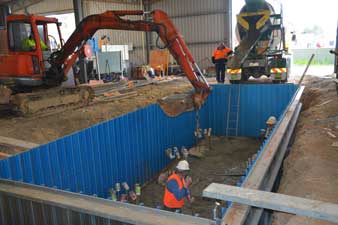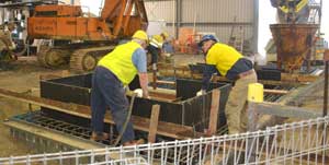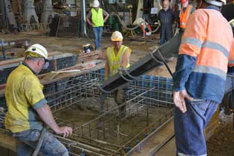 Countless hours went into the restoration of the engine components but the aim was to have it operational. The engine required a massive foundation and thousands more hours and great expense went into it. Warwick Bryce and Bill Dazenko each put over 1000 hours into the construction and many other members assisted. The foundation is based on the installation design stipulated by English Electric when the engine was delivered but is complicated by the nature of the soil on the Steam Centre site. Soil tests indicated problems with site necessitating piers sunk 5 metres down to solid supporting mud stone. The pit for the foundation was then excavated and lined, then a blinding layer of concrete was poured. The reinforcing was constructed then the concrete was poured in stages boxed out to form the pits required for air bottles and the fly wheel Finally the above ground plinth was boxed up and poured. All foundation work was completed and the engine loosely assembled just in time for the club's 50th rally.