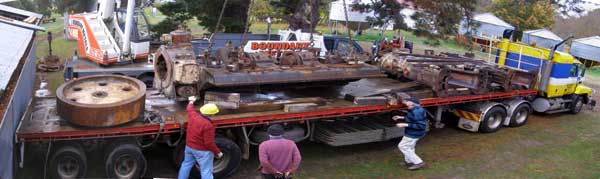 By 1953 it had been moved to the CUB Yorkshire Brewery malting works. It was decommissioned following failure of the No. 2 connecting rod bearing in 1969. The engine sat there until 1982, when Ray Gillett, then a club member, aquired the engine dismantling and removing it. In 1988, Ray donated it to the Museum of Victoria, who hoped to erect it at the MSTEC site but the club had no shed space to house the engine and no funds for the installation. An offer came from the Puls brothers to house it in their Redhill museum which the Museum of Victoria accepted. It sat on static display in the Puls’ museum until 2010 when the museum closed. The Puls donated the engine to the club provided the club paid the costs associated with the move. This included removing and replacing the roof of the shed that had been built around the engine. Cranes and trucks were hired and a small team got the engine back to the club.